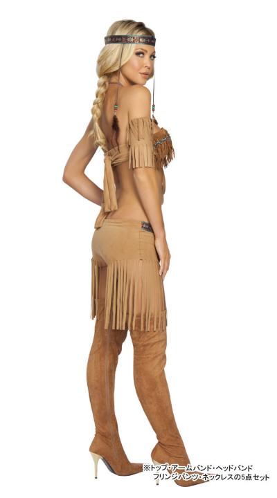 たくさんのビーズのついたトップに、紐のように細く切られたショーツがとってもワイルド☆ とても強そうなインディアンの戦士に大変身! 【セット5点】 ?ビーズ付きのトップス ?アームバンド ?ヘッドバンド ?ショーツ ?ネックレス ※ブーツは含まれておりませんので、ご了承ください。