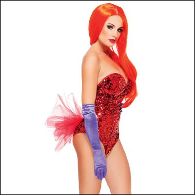 ロジャー・ラビットの妻でセクシー過ぎるジェシカのコスチューム☆ 真っ赤でキラキラしたボディースーツは刺激的ですね。 お尻にフワフワしたしっぽが☆ ※こちらの商品はウイッグと靴は含まれませんので、ご了承ください。 【セット内容】 ?赤いボディースーツ ?紫のグローブ