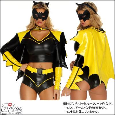 黒と黄色を合わせたとってもセクシーなバッドガールのコスチューム☆ コウモリの形をしたマスクがミステリアス! バッドマンに負けずにセクシーで強く、敵をやっつけましょう! ※靴とマントは含まれておりません。 【セット5点】 ?耳のついたヘッドバンド ?トップス ?ベルトのついたハイウエストショーツ ?マスク ?黄色のアームバンド
