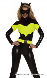 黒と蛍光の黄色のキャットスーツが夜の暗闇を輝かせます! キャットスーツは体にフィットしてとてもセクシー☆ これであなたもダークナイト☆ ※靴とマントは含まれておりません。 【セット3点】 ?ベルトのついたキャットスーツ ?耳のついたヘッドバンド ?マスク