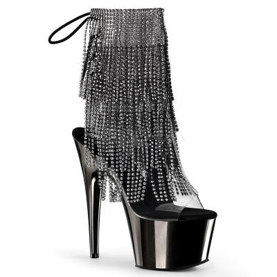 7 インチ (17.8 cm) スチレットヒール、2 3/4 インチ (7 cm) クローム メッキ プラットフォーム オープンつま先/小剣かかとバックレース アップ足首ブート 4 層クロムメッキを特色シミュレート ラインス トーン フリンジ、ジッパー閉鎖中