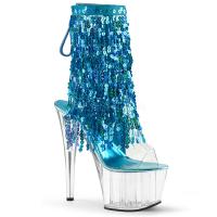 7 インチ (17.8 cm) ヒール、2 3/4 インチ (7 cm) PF オープンつま先またはかかとレースアップ バック アンクル ブーツ ジッパー閉鎖中の 4 層スパンコールのフリンジの特徴