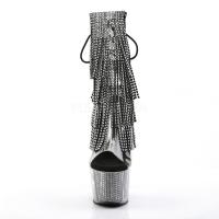 7 インチ (17.8 cm) スチレットヒール、2 3/4 インチ (7 cm) プラットフォーム レースアップ バック足首ブート搭載 4 レイヤー フリンジ ・ クローム メッキ、シミュレート ラインス トーンいっぱいプラットフォーム