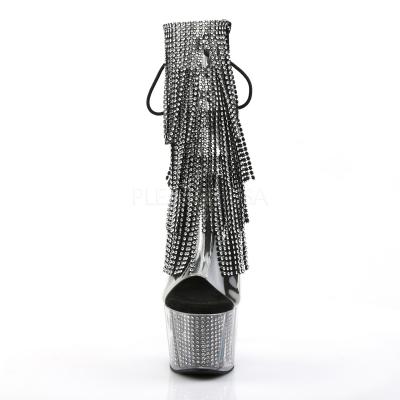 ◆ 7 インチ (17.8 cm) スチレットヒール、2 3/4 インチ (7 cm) プラットフォーム レースアップ バック足首ブート搭載 4 レイヤー フリンジ ・ クローム メッキ、シミュレート ラインス トーンいっぱいプラットフォーム ◆