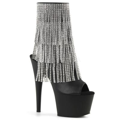 7 インチ (17.8 cm) スチレットヒール、2 3/4 インチ (7 cm) プラットフォーム オープンつま先/スティレット ヒール フリンジ足首ブート 3 層クロムメッキを特色シミュレート ラインス トーン フリンジ、ジッパー閉鎖中