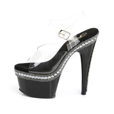 7 インチ (17.8 cm) スチレットヒール、2 3/4 インチ (7 cm) プラットフォーム アンクルス トラップ サンダル プラットフォーム ・ スティレット ヒールにラインス トーン装飾を備え