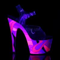 7 インチ (17.8 cm) 2 3/4 インチ (7 cm) プラットフォーム アンクルス トラップ サンダル UV 反応性の抽象的なモザイク アートをフィーチャーしたスチレットヒール プラットフォーム全体にデザイン