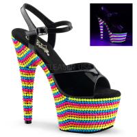 ◆ 7"(17.8cm) かかと、全体を備え 2 3/4"(7cm) PF アンクルス トラップ サンダル底ちりばめられた W/ネオン UV 反応性マルチカラー石 ◆