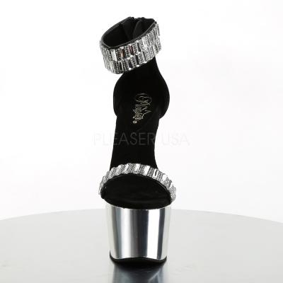 7 インチ (17.8 cm) スチレットヒール、2 3/4 インチ (7 cm) クローム メッキ プラットフォームがバック サンダル ラインス トーンと足首の袖口・つま先ストラップをくまなく装飾ミラーを閉じて戻って Zip 閉鎖