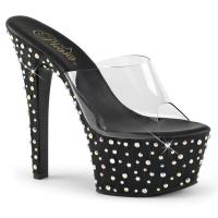 ◆ 6 インチ (15.2 cm) ヒール、2 1/4"(5.7 cm) プラットフォーム スライド全室ビーガン革中敷と底にちりばめられた複数サイズのラインス トーン ◆