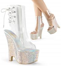 6 1/2 インチ (16.5 cm) ヒール、2 3/4 インチ (7 cm) プラットフォーム オープンつま先またはかかとレースアップ バック ウェッジ足首のトランクリッドにラインス トーンのちりばめられたすべてウェッジ下、ジッパー閉鎖中