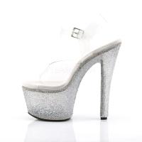 7 インチ (17.8 cm) ヒール、2 3/4 インチ (7 cm) プラットフォーム アンクルス トラップ サンダル シルバー マルチのラインス トーンで装飾されたプラットフォーム全体の特徴