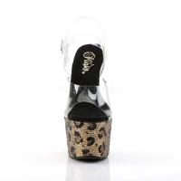 7 インチ (17.8 cm) ヒール、2 3/4 インチ (7 cm) プラットフォーム アンクルス トラップ サンダル ラインス トーン ヒョウの皮パターンで装飾された全体のプラットフォームを搭載