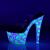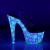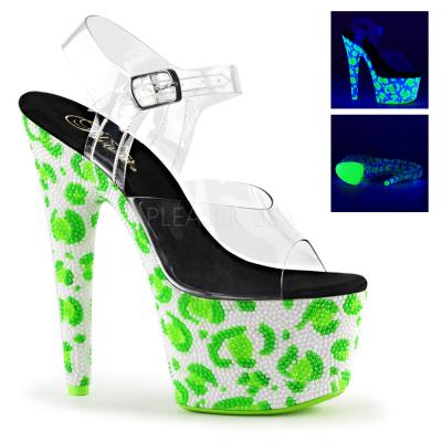7 インチ (17.8 cm) ヒール、2 3/4 インチ (7 cm) プラットフォーム アンクルス トラップ サンダル ヒョウの皮パターンとブラック ライトの敏感なアウトソール/Toplift のプラットフォーム全体をカバー ブラック ライト敏感なラインス トーンの特徴