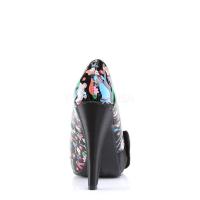 4 1/2 インチ (11.4 cm) ヒール、1"(2.5 cm) 隠されたプラットフォームが大きなサテンの弓とつま先のポンプをオープンします。