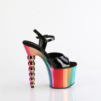 7インチ(178mm)スタックビーズヒール、3 1/4(83mm)プラットフォームアンクルストラップサンダル、レインボークロームメッキプラットフォームボトム