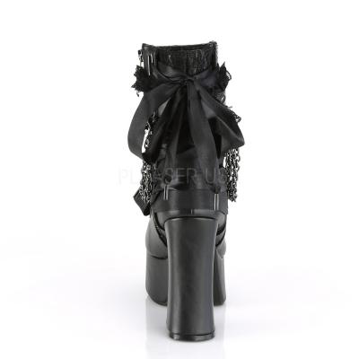 4 1/2 インチ (114 mm) ブロック ヒール、2 インチ (51 mm) プラットフォーム足首ブート搭載フロント ・ バック サテン リボン編み上げの詳細と吊りチェーンの詳細、ジッパー閉鎖中 w/フリル付きアンクルス トラップ(PF Ankle Boot, Side Zip)