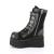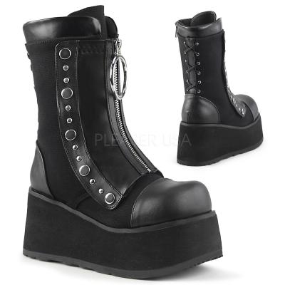 3 1/2 インチ (89 mm) 隠されたプラットフォーム レースアップ ウェッジふくらはぎ起動センター、特大 o リングのジッパープルでフロント スナップにストレッチ パネル搭載金属ファスナーの w/スタッドの魔性の女とバック、金属ジッパー閉鎖中でコルセット レース デザインの詳細