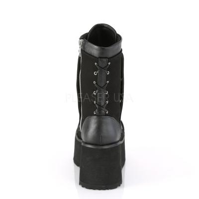 3 1/2 インチ (89 mm) 隠されたプラットフォーム レースアップ ウェッジふくらはぎ起動センター、特大 o リングのジッパープルでフロント スナップにストレッチ パネル搭載金属ファスナーの w/スタッドの魔性の女とバック、金属ジッパー閉鎖中でコルセット レース デザインの詳細