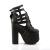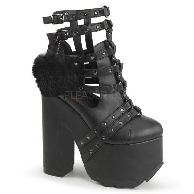 6 1/2 インチ (16.5 cm) ヒール、3 インチ (7.6 cm) PF ケージ足首ブート スタッド ・ O-リングと、取り外し可能なふわふわハート型チャームとボンテージ スタイルのストラップを備え、バック ジッパーの金属