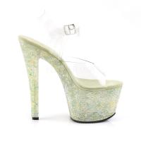 7 インチ (17.8 cm) スチレットヒール、2 3/4 インチ (7 cm) プラットフォーム アンクルス トラップ サンダル プラットフォーム全体をカバーするマルチ クリスタル タイルの特徴