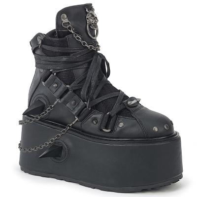3 1/2インチ(90mm)ラバークロー装飾プラットフォームレースアップフロントアンクルブーツ。デビルのオーナメント付き、パッド付きのオーバーサイズタン、メタル楕円リング、ラウンドスタッド、ラバークロー、吊り下げチェーンのディテール(『Demonia』ブランドのラバーエンブレム付き)、背面メタルジップクローズ