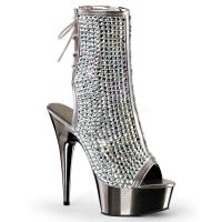 スチレットヒール 6 インチ (15.2 cm)、1 3/4 インチ (4.5 cm) クローム メッキ プラットフォーム オープンつま先またはかかとレースアップ バック足首ブート全室ダイヤモンド カット ラインス トーン ジッパー閉鎖中の全体の上部をカバー