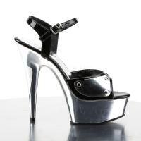 6 インチ (15.2 cm) スチレットヒール、シミュレートされた特徴の 1 3/4 インチ (4.5 cm) プラットフォーム アンクルス トラップ サンダル、金属メッキ ヴァンプとクローム メッキ下部