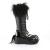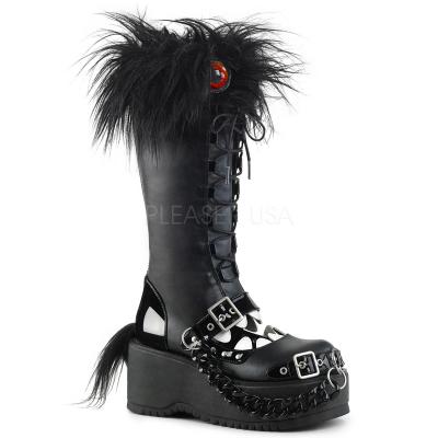 3 1/4 インチ (83 mm) プラットフォーム レースアップ ニーハイ モンスターのトランクリッドに偽ものの毛皮の襟、口の形をカット w/ヴァンプのコントラスト歯、舌の上の眼球、かかととプラスチック製ハンギング チェーン詳細、バック ジッパーでポニーテール(PF Lace-Up Knee High Monster Boot, Back Zip)