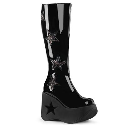 5""(127mm)スターカットアウトプラットフォームウェッジ膝ハイブーツは、グリッタースターサイドパッチの詳細、内側の金属ジッパーを備えています(Star Cutout PF Wedge Knee High Boot, Inside Zip)