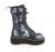 2インチ(51mm)プラットフォームレースアップフロントミッドカーフブーツ、スカルとデスモスのプリントアートワーク、デスモスバックルストラップとストラップのメタルクロースタッド、アウターメタルジップクロージャー(Platform Calf High Lace-Up Boot W/ Outer Metal Zipper)