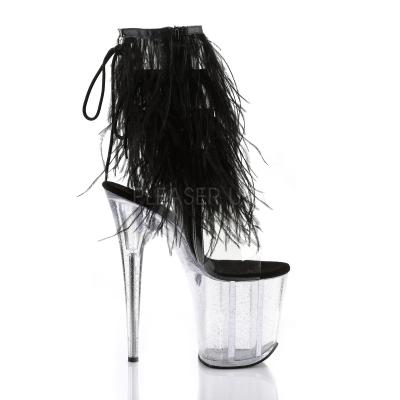 8 インチ (203 mm) かかと、4 インチ (102 mm) プラットフォーム オープンつま先またはかかとレースアップ バック足首ブート ジッパー閉鎖中の 4 層 Marabou 毛皮フリンジの特徴
