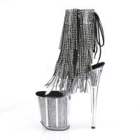 8 インチ (200 mm) かかと、4"(100 mm) プラットフォーム レースアップ バック足首のトランクリッドに 4 層フリンジ ・ クローム メッキ、シミュレート ラインス トーンいっぱいプラットフォーム、ジッパー閉鎖中フル(PF Open Toe/Heel Fringed Ankle Boot, Side Zip)