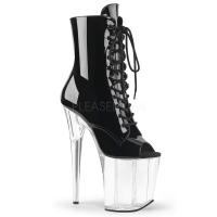 ◆ スチレットヒール 8 インチ (20.3 cm)、4 インチ (10.2 cm) プラットフォームのぞき見つま先のレースアップ フロント足首ブート、ジッパー閉鎖中 ◆