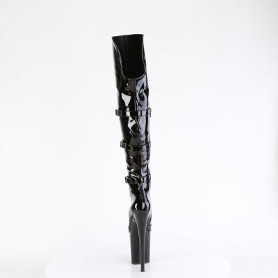 8インチ(200mm)ヒール、4インチ(100mm)プラットフォームトリプルバックルストラップストレッチオーバーザニーブーツ、2/3インナーサイドジッパークロージャー(PF Triple Buckle Strap OTK Boot, Side)