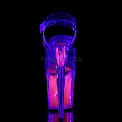 8 インチ (203 mm) かかと、4 インチ (102 mm) プラットフォーム足首ストラップ サンダル特徴ブラック ライト反応性 PVC を炎の中ヒールとプラットフォーム下