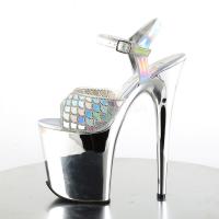 ヒール 8 インチ (203 mm)、4 インチ (102 mm) プラットフォーム アンクルス トラップ サンダル ホログラム マーメイド スケールを備えた上にラインス トーン付きデザイン ・ クローム メッキのプラットフォーム下