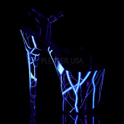 8 インチ (20.3 cm) スチレットヒール、4 インチ (10.2 cm) プラットフォーム アンクルス トラップ サンダル UV ブラック ライト反応性雷を備えたプラットフォーム上ボルトします。(PF Ankle Strap Sandal)