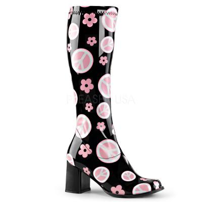 3 インチ (7.6 cm) ヒール ゴーゴー ブート、特徴花柄ストレッチの特許をブロック ・平和印刷すべて上・ シャフト、フルレングス内側 Zip 閉鎖(Block Heel, Gogo Boot, Str. Pat, Side Zip)