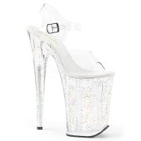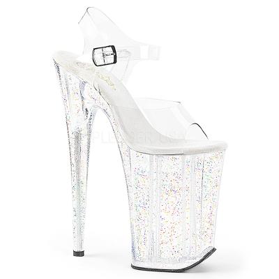 9」(22.9 cm) ヒール、5 1/4"(13.3 cm) プラットフォーム アンクルス トラップ サンダル プラットフォーム全体のミニの虹色のきらめきを搭載(PF Ankle Strap Sandal w/Mini Glitter)