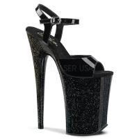 9」(22.9 cm) ヒール, 5 1/4"(13.3 cm) プラットフォーム足首ストラップ サンダル プラットフォーム全体の警告のミニの虹色のきらめきを備えた: 極端なハイヒール。ウォーキングやダンスは推奨されません。