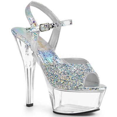 6 インチ (152 mm) かかと、1 3/4"(45 mm) フロント ヴァンプの Slv マルチ ラインス トーン付けプラットフォーム アンクルス トラップ サンダル(PF Ankle Strap Sandal w/ RS Vamp)