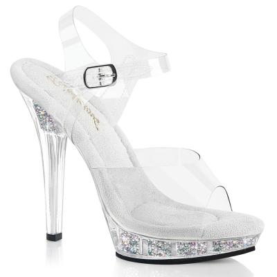 5インチ(127mm)ヒール、3/4インチ(19mm)プラットフォームアンクルストラップサンダル。プラットフォームの底とヒールにABラインストーンが挿入されています(PF Ankle Strap Sandal w/ RS Inserts)