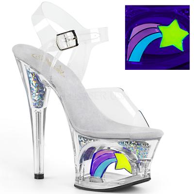 7 インチ (178 mm) かかと、2 3/4 インチ (70 mm) カットされたプラットフォーム アンクルス トラップ サンダル プラットフォームの切り欠きとプラットフォームとヒールに挿入された星・月の形輝く内部ブラック ライト反応シューティング スターの特徴