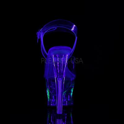 7 インチ (178 mm) かかと、2 3/4 インチ (70 mm) カットされたプラットフォーム アンクルス トラップ サンダル プラットフォームの切り欠きとプラットフォームとヒールに挿入されますゴールデンナ輝く内部にブラック ライト反応米ドル記号を搭載