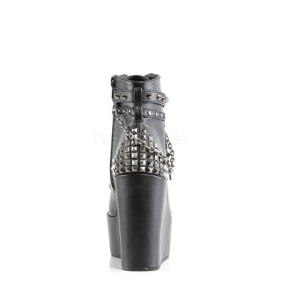 5 インチ (12.7 cm) ウェッジ プラットフォーム レースアップ フロント アンクルブー ティー五芒星の詳細とスタッズ付きストラップ、スカルヘッド、照明、安全ペン ・ ピラミッド スタッズ ジッパー閉鎖中の後ろにクロスのチャームとチェーン周りのラップをフィーチャー(Wedge PF Boot w/Straps, Studs, Assorted Charms & Chain)