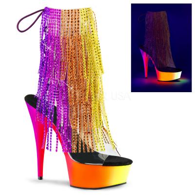 6"(15.2cm) かかと、1 の 3/4"(4.5cm) プラットフォーム オープンつま先またはかかとバックレース アップ足首ブート 4 層クロムメッキを特色シミュレート色とりどりラインス トーン フリンジと UV ブラック ライト反応色とりどりのプラットフォーム下、ジッパー閉鎖中