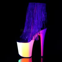 8"(20.3cm) かかと、4"(10.2cm) プラットフォーム オープンつま先またはかかとバックレース アップ足首ブート 4 層クロムメッキを特色シミュレート色とりどりラインス トーン フリンジと UV ブラック ライト反応色とりどりのプラットフォーム下、ジッパー閉鎖中