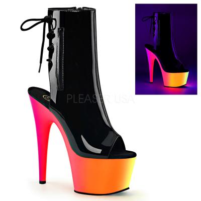 7 インチ (17.8 cm) ヒール、2 3/4 インチ (7 cm) プラットフォーム オープンつま先またはかかとバックレース アップ ブーツ ネオン UV 反応性色とりどりのプラットフォーム、ジッパー閉鎖中の特徴(PF Ankle Boot w/Neon UV Reactive BTM)