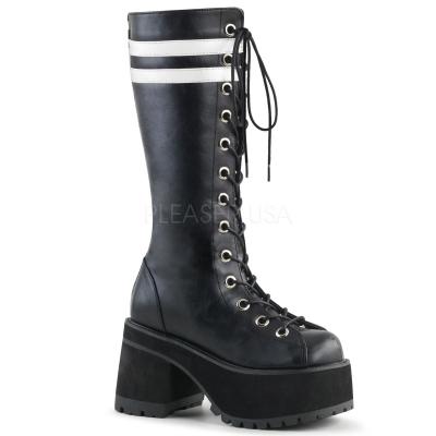 3 3/4"(95 mm) かかと、上部、背面の金属ファスナーで 2 つの対照的な白のストライプの w/2 1/4 インチ (57 mm) プラットフォーム レースアップ フロント膝ブート(PF Knee High Boot, Back Metal Zip)